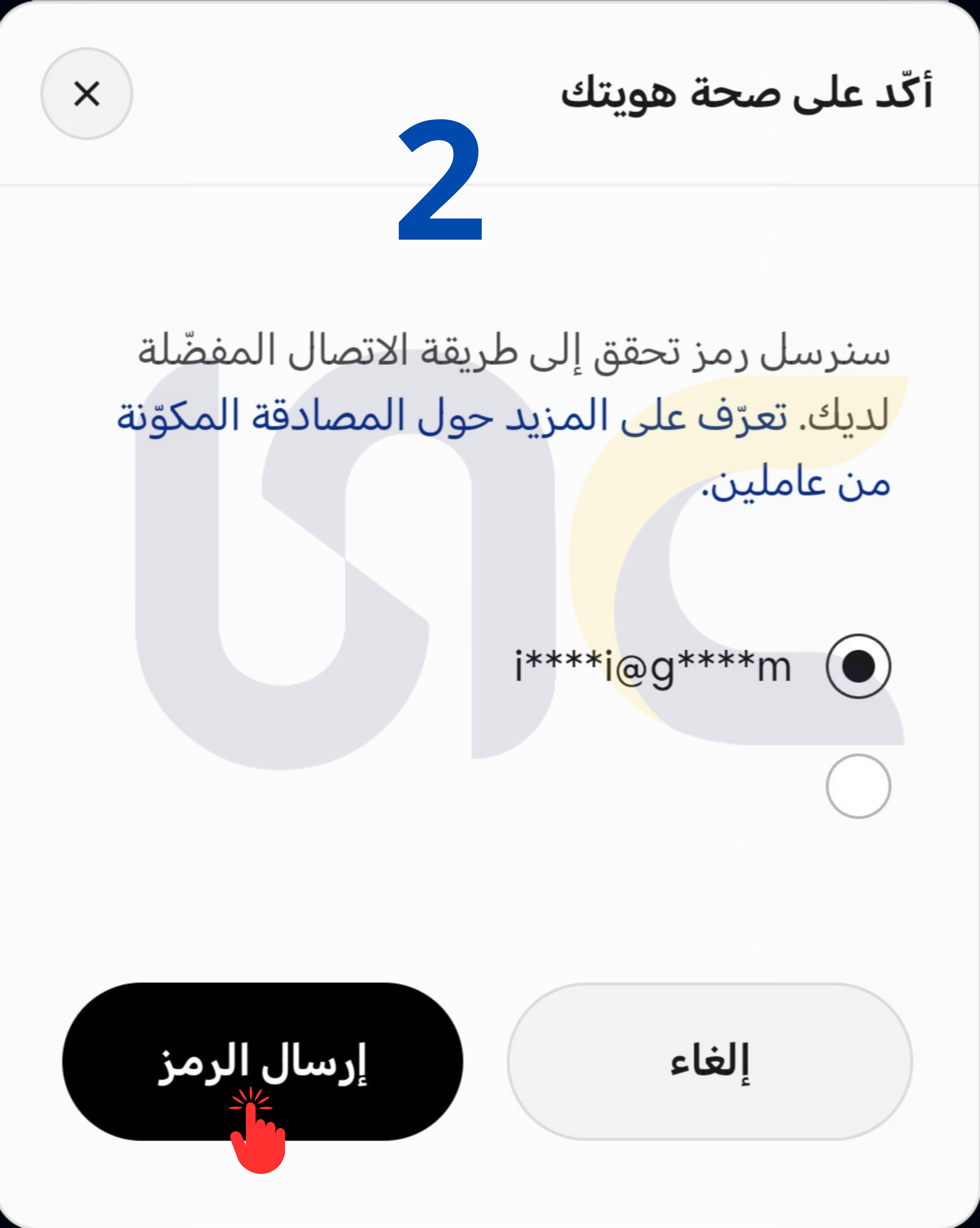 بعدها اختر طريقة إرسال الكود عبر الايميل او رسالة نصية على جوالك